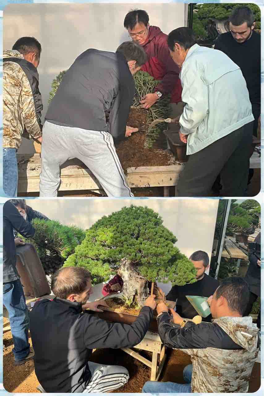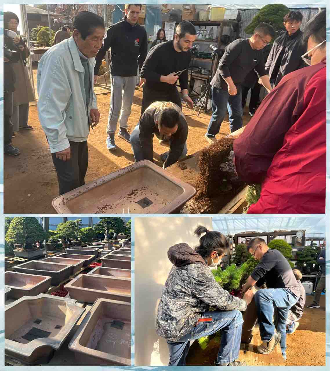 分業制で、根を処理する経験の高い者、研修中の者は鉢の下準備、そして最終的な木村先生による確認と植え付け❗️