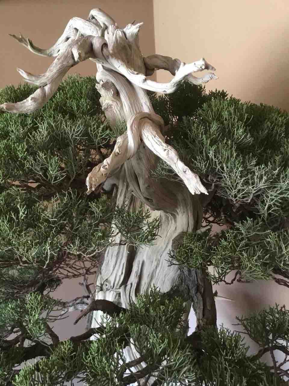先日 名匠木村正彦先生の所から来た、真柏の大型古木に満開の寒桜。