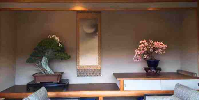 朧の月の掛け軸と共に、寒桜の“刹那”の美・真柏の連綿と続く荘厳な命の営み、盆栽の持つ美と精神の両面を飾ってみました。