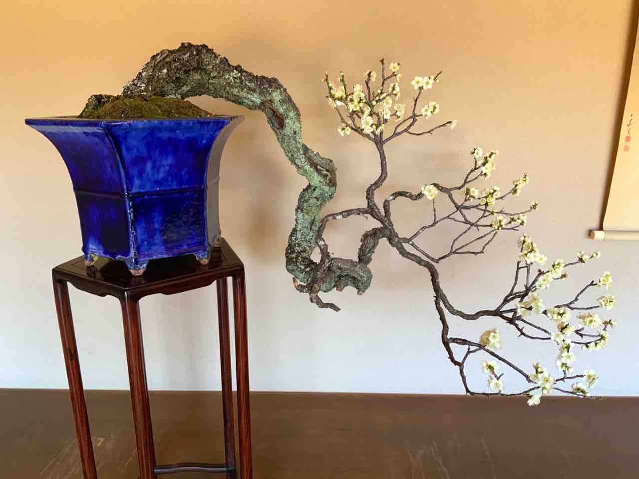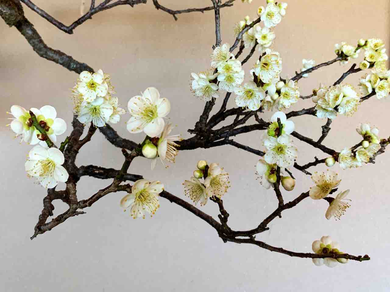 つい数日前、慌しい国風展・水石展を終えて、久しぶりの床の間飾りを盆梅で設えたのに、もう花は満開を迎えて、