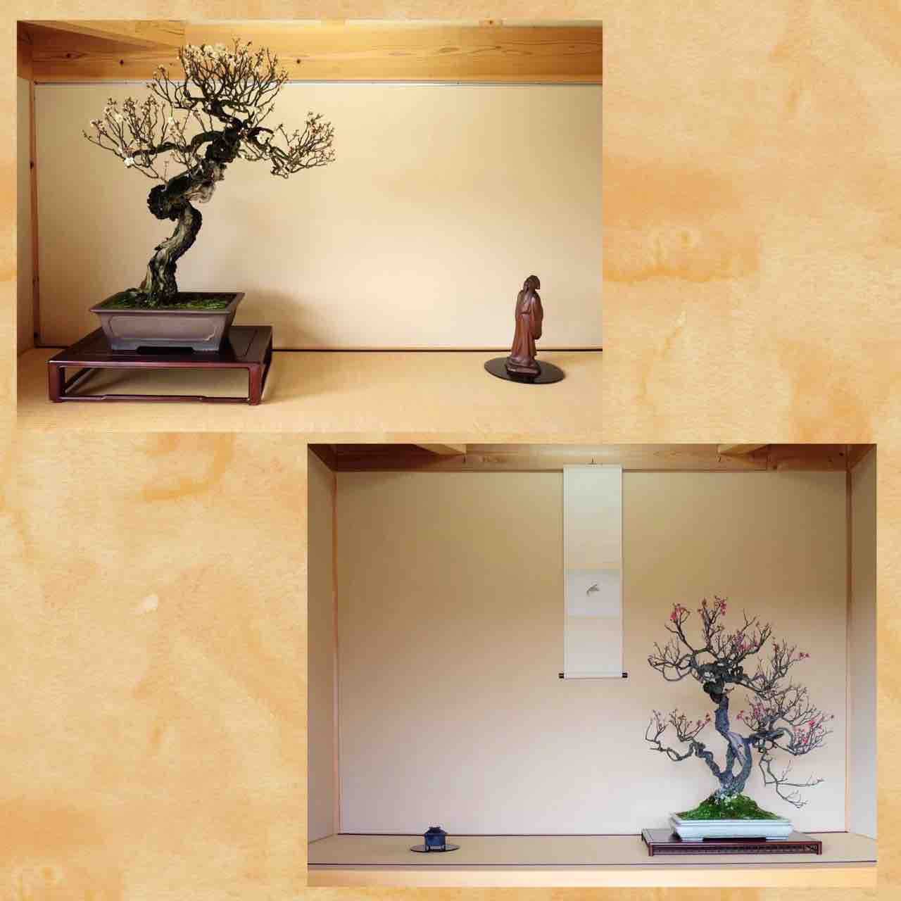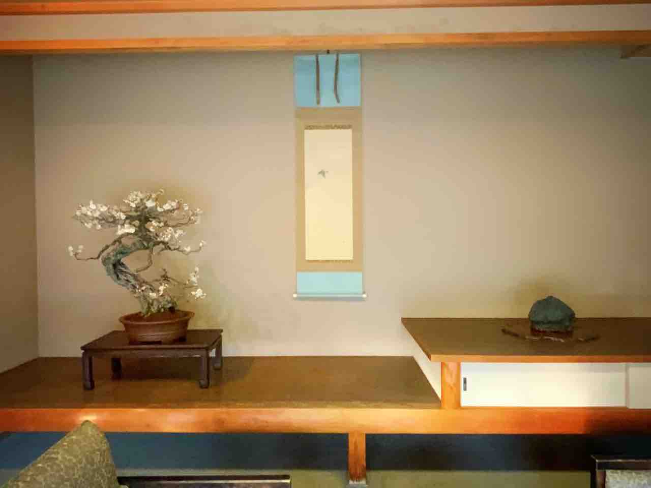 床の間に「うぐいす」の掛物を合わせて、盆梅の完成した席を創ってみました。
