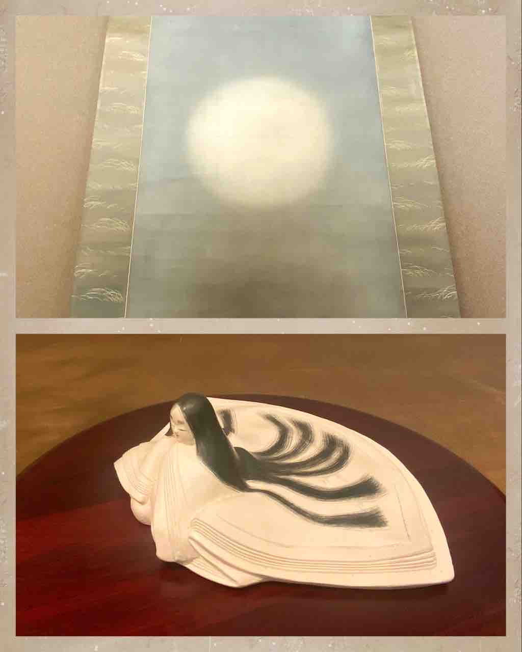 慌てて床飾り💦先日の寒桜の時にかけた“おぼろ月“と、20年前に京都で誂えた清水焼の人形、その名も「おぼろ」これをそのままに枝垂れ桜を飾りました。