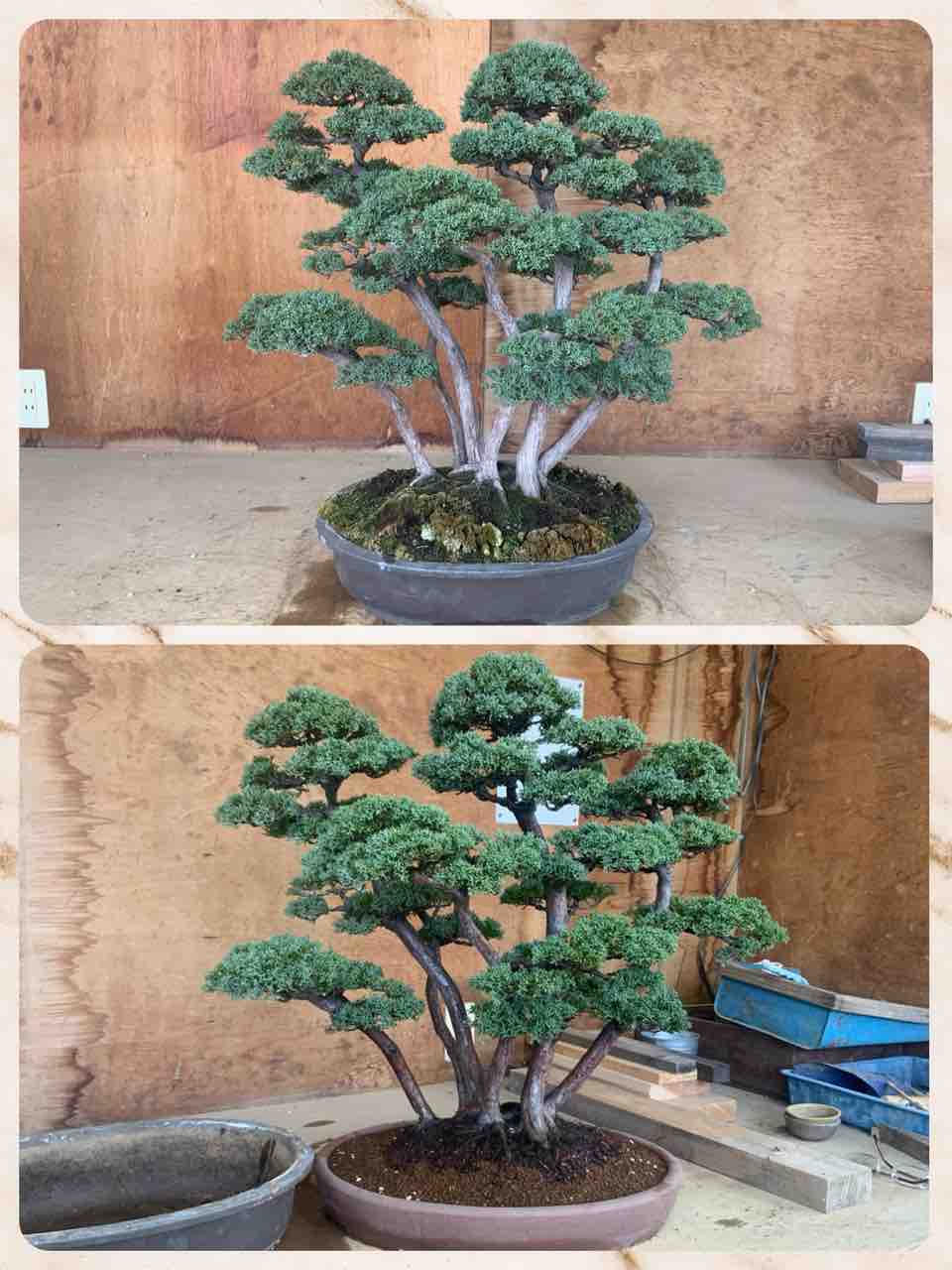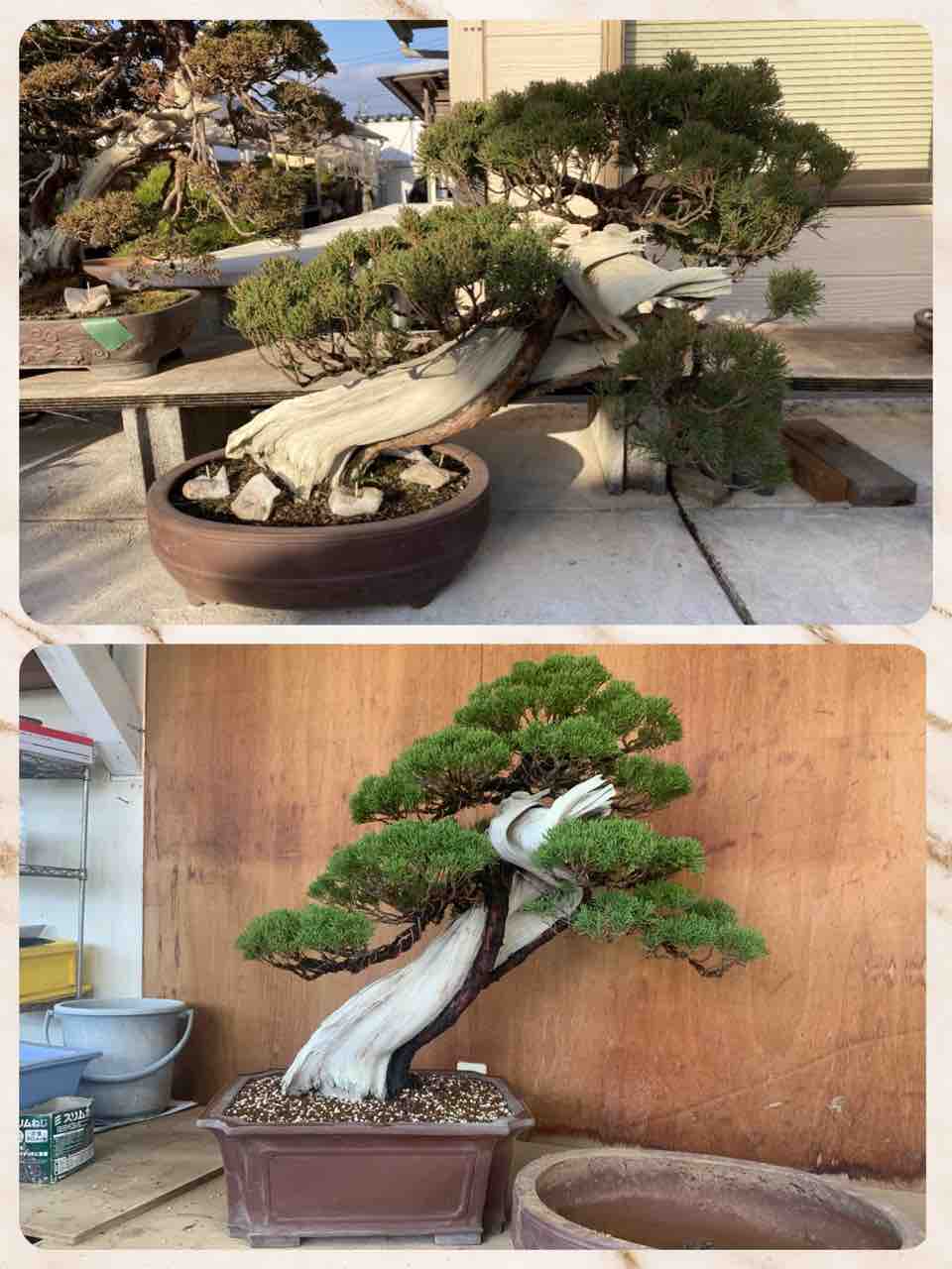 山採り後、根元の切り落とした舎利幹がそのままになっていた真柏、整姿と植替えで、皆さんに観て頂ける盆栽へと導く。