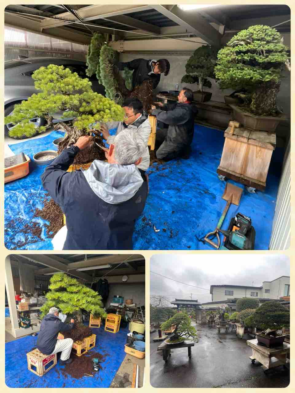 氷雨の中、大型盆栽の春の植替えと手入れ❗️